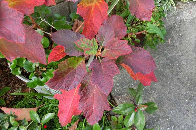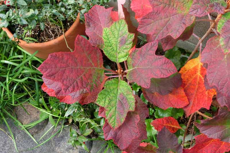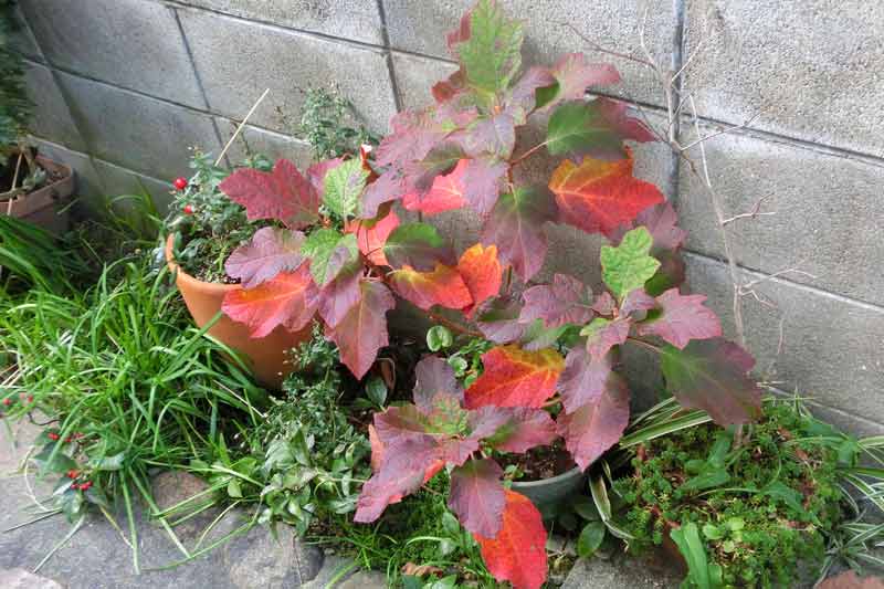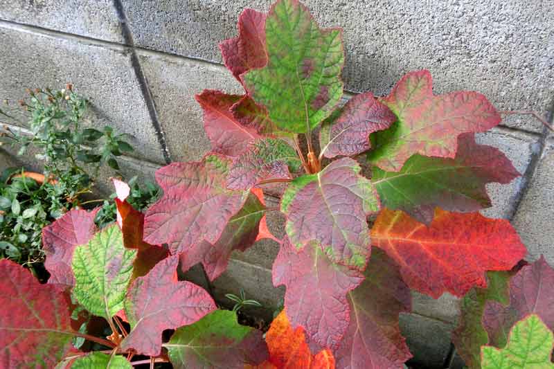 朝日を浴びて色合いが綺麗に染まったサルスベリの紅葉