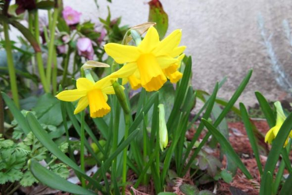 3) ニホンスイセンは、は房咲き水仙の仲間で、1本の茎にいくつもの花をつけますが、これに対してキクラミネウス系は、1つの茎に普通1つの花をつけ、花びらが反り返ります。ティタティタはその園芸品種だそうです。