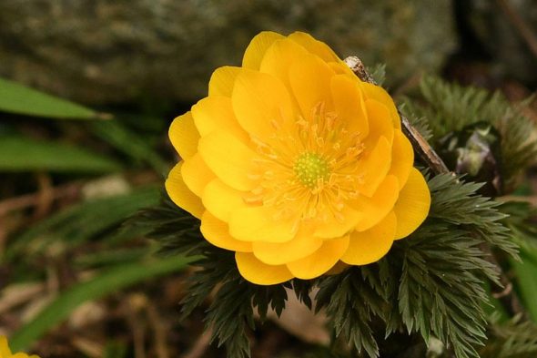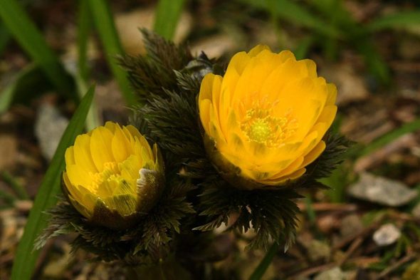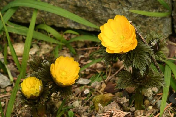 2) 日本では、フクジュソウおよびミチノクフクジュソウが北海道から九州にかけて、キタミフクジュソウが北海道東部、シコクフクジュソウが四国と九州の一部に自生しているそうですね。