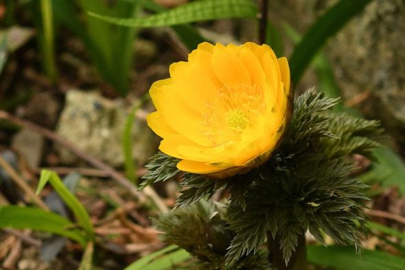 我が家のフクジュソウがやっと咲き出しました。