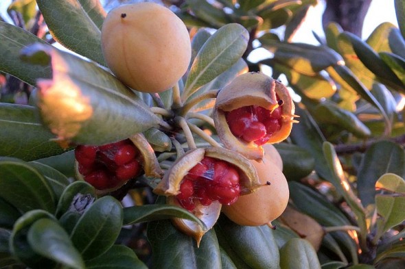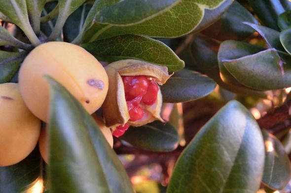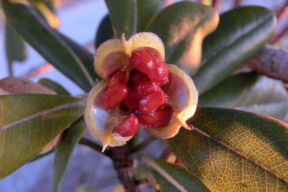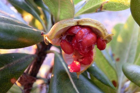以前、トベラの実でもまだ開いていないのを掲載したのですが、今回は中から赤い実が飛び出したところを撮って来ました。