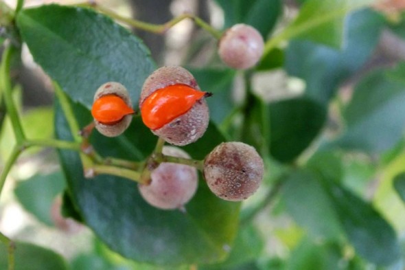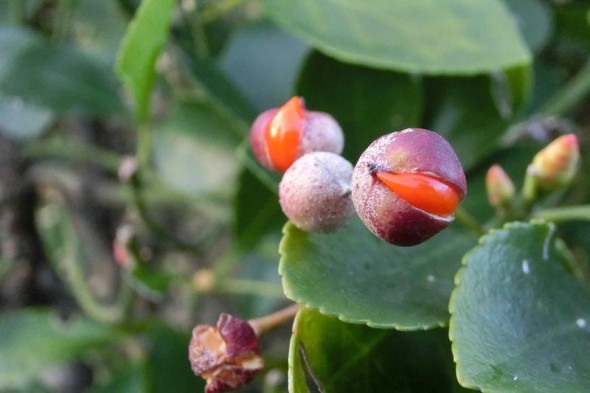 2)実が弾けて、中から赤い種が顔を覗かせています。