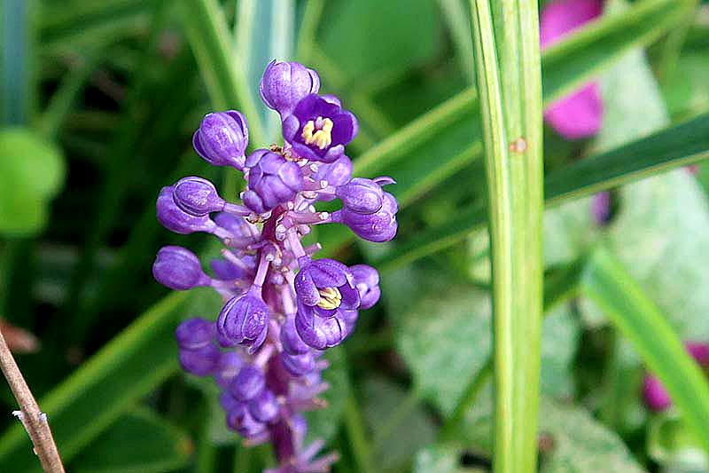 ヤブランの濃い紫の花に黄色い蕊、綺麗に咲いていますね。