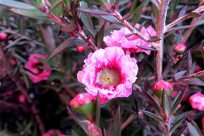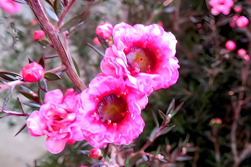2) ニュージーランドやオーストラリア原産の常緑低木で、細い枝に赤や桃、白などの、ウメの花に似た小さな花を多数咲かせるそうです。