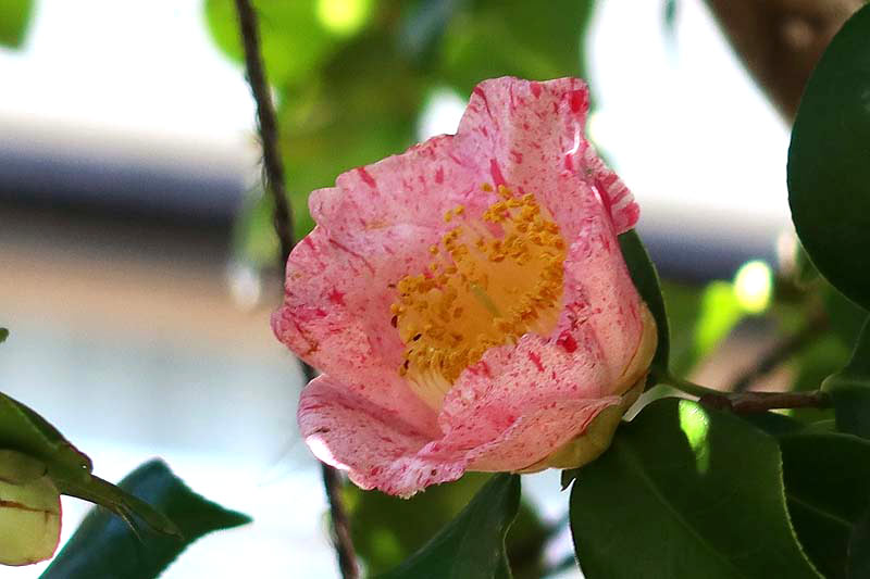 絞りのような色合いの椿、とても綺麗に咲いていますね。