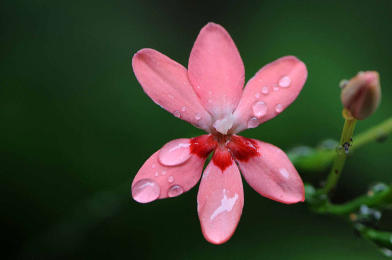 1)最初は、濃いピンクの花びらで、中心部が赤い「ヒメオオギ(姫扇)」 アヤメ科です。