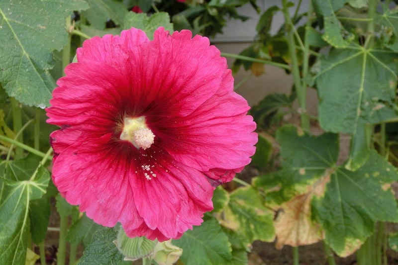 4)こちらも同じ「タチアオイ」ですが、白い花に中心部が真紅のお花です。