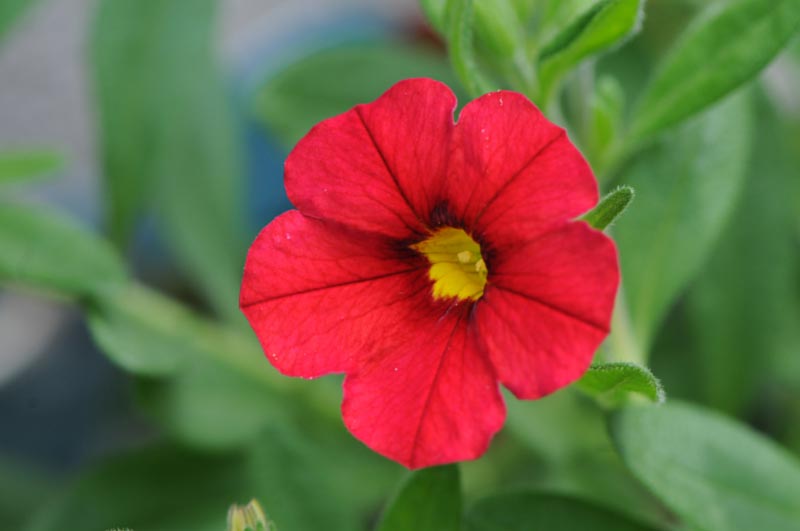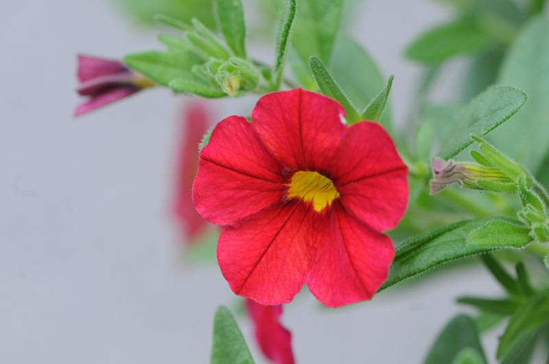 綺麗な赤い花、最近は品種改良が進んでいるのでよく分らなくなっていますが、大枠では「ペチュニア」の仲間でしょうね。