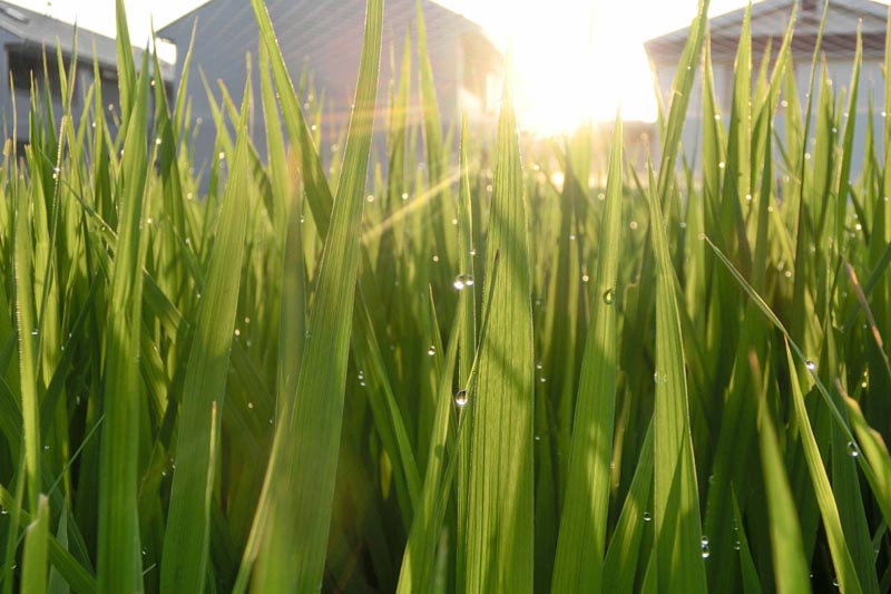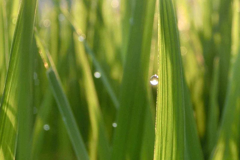 稲の葉に付いた朝露、とても小さいですが、まん丸で可愛らしいですし