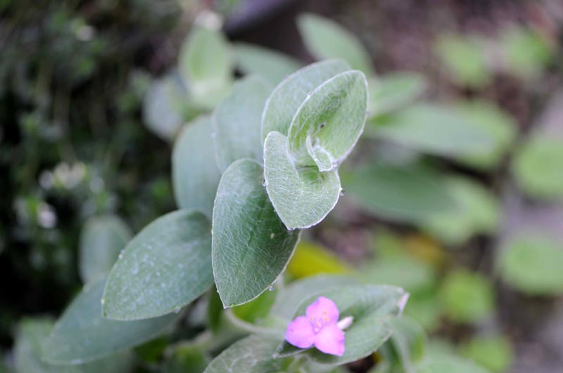 和名を白雪姫と言うそうですが、葉っぱが白色の軟毛に覆われているからでしょうね。ツユクサ科ですので、ムラサキゴテンにそっくりなお花を咲かせていますよ。
