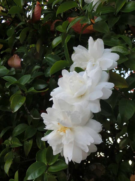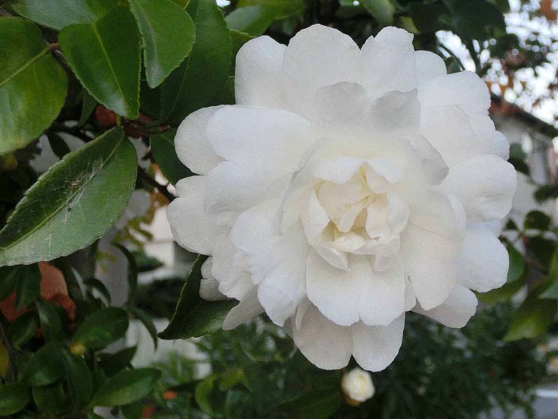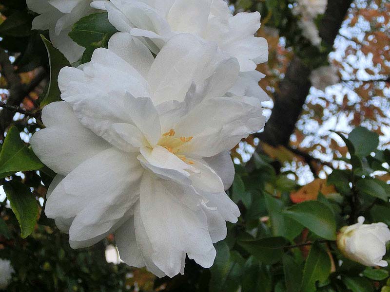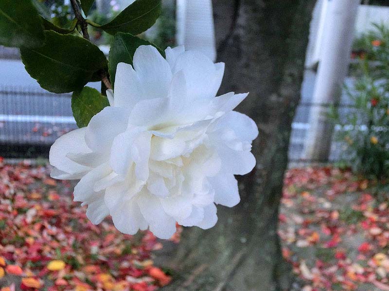 1)最初は、純白で八重咲き品種の「サザンカ(山茶花)」 ツバキ科 のお花です。