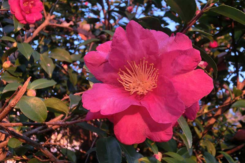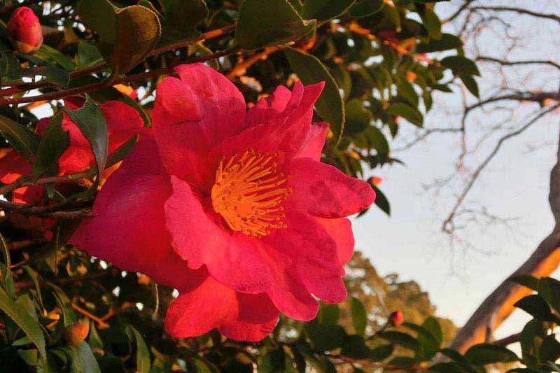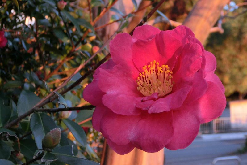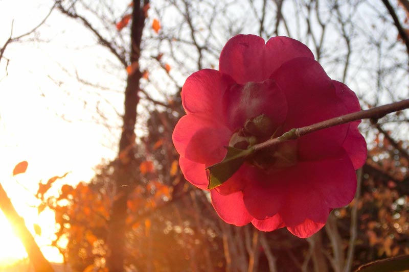 朝日を浴びて輝く赤い山茶花、綺麗ですね♪