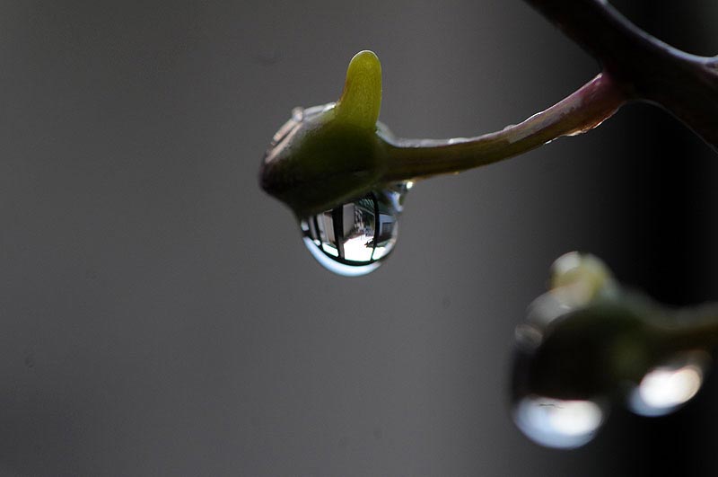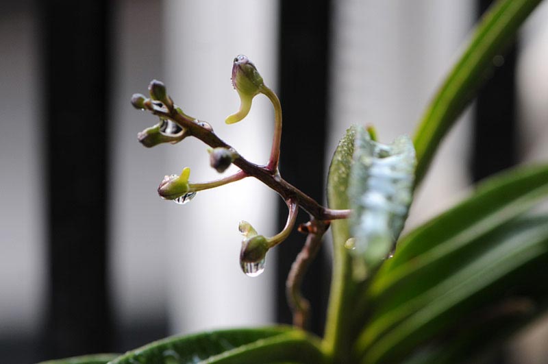 3)こちらは、「青風蘭」の蕾に付いた散水雫です。
