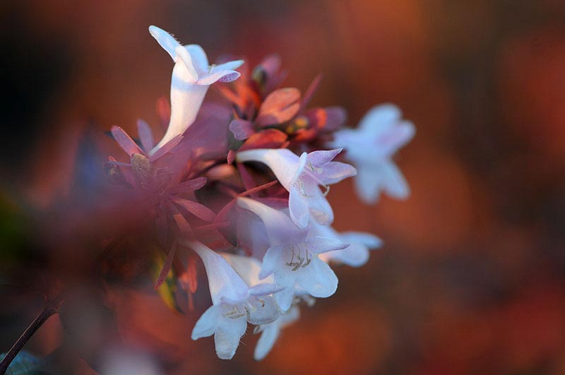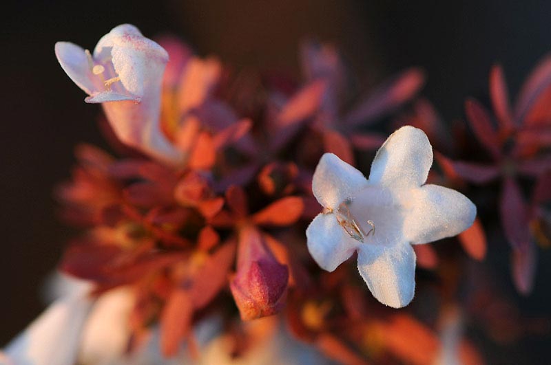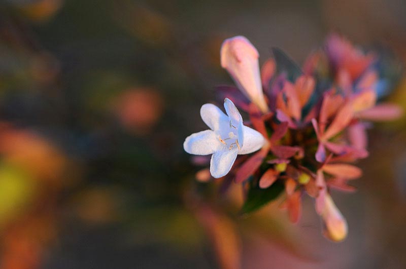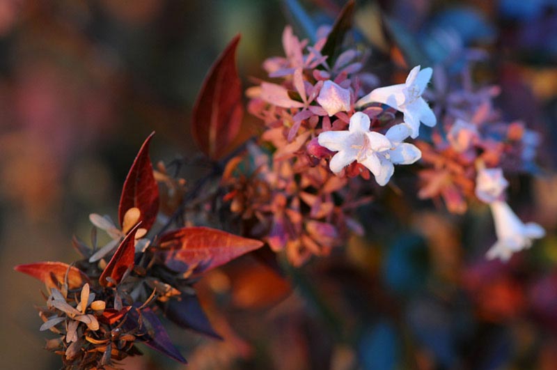 花期的には4-6月に咲くはずのツクバネウツギ、園芸品種だからでしょうか、葉っぱが紅葉しているのに花を咲かせていました。