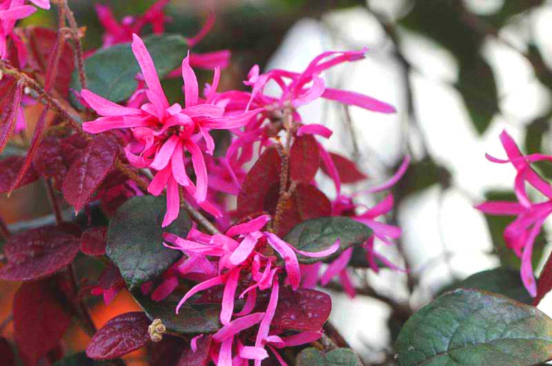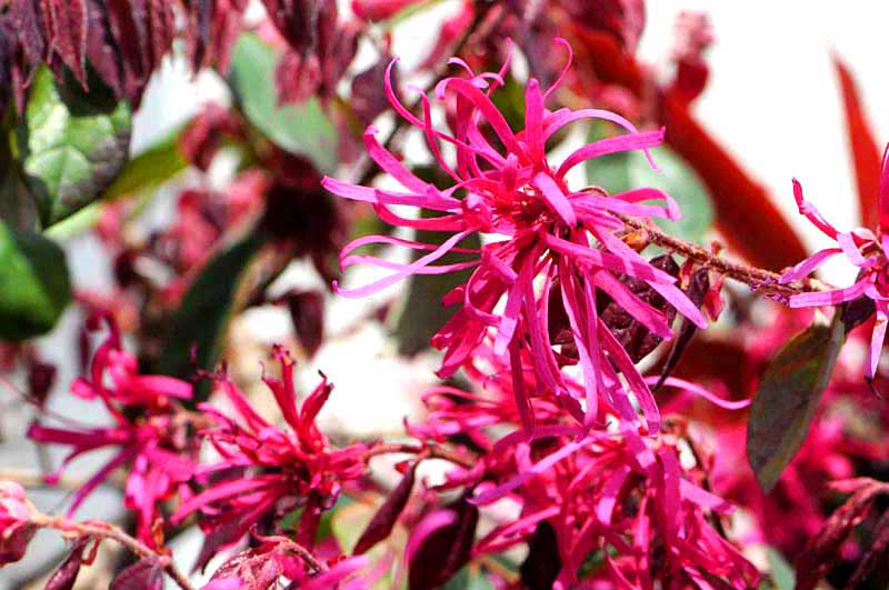 7)マンサクの変種にあたり、紅紫色の花を咲かせます。葉が赤紫になる「銅葉」と緑色の「緑葉」があり、美しい花色で鑑賞価値も高いことから、庭木にも広く利用されているようですね。