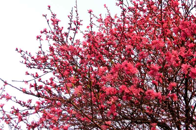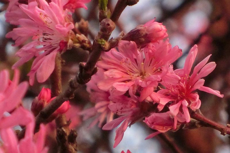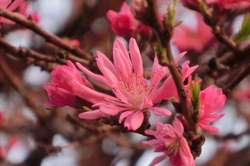3)濃い紅色の八重咲き。花期は3月下旬から4月上旬ごろ。