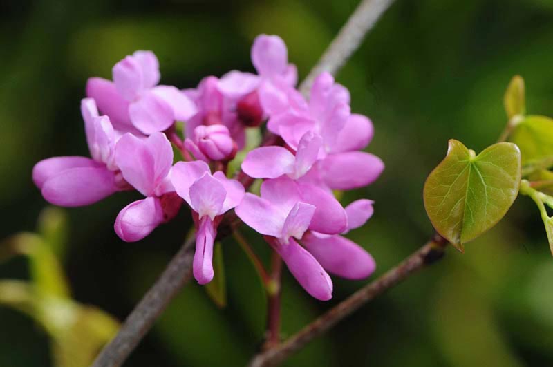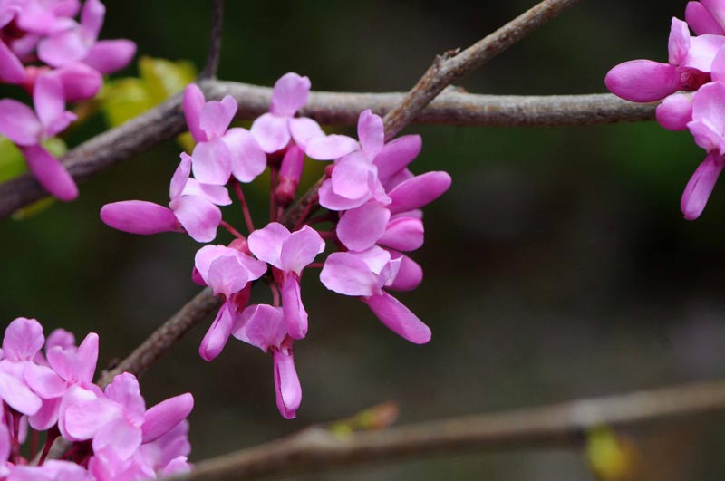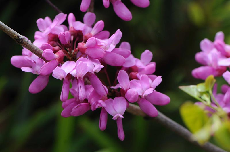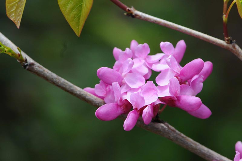 3)花の咲く時期は4-5月、葉を出す前に葉の付け根に蝶型の花が数輪まとまって咲きます。花は赤紫色で、大きさは約2cmです。