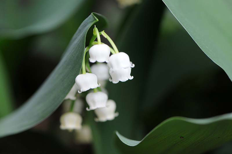 8)花壇などで栽培されているのは、ヨーロッパ原産のドイツスズランで、「スズラン(鈴蘭)」より大型で、花と葉の高さがほぼ同じです。スズランは花が葉よりも低い位置で咲きますので、そこで見分けられるようです。