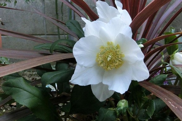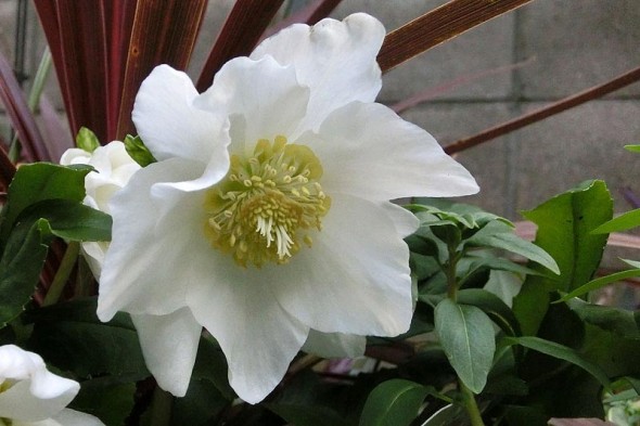 2)開花時期:中咲きで、花は小輪の一重、色は白色、葉に白斑がはいっています。