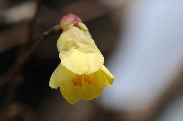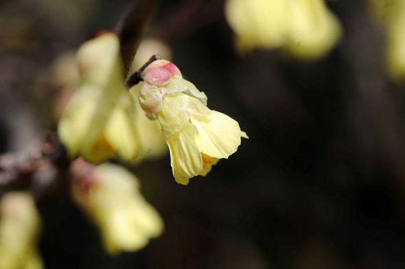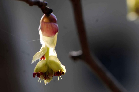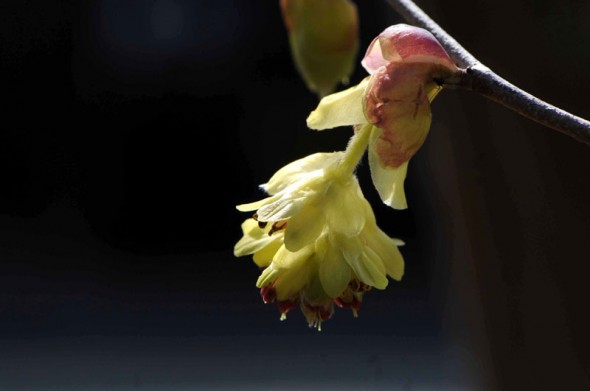 4)逆光で撮ったトサミズキ、蕊の赤いのがよく分るでしょう。