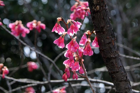 4)逆光で浮かび上がるように撮ってみた寒緋桜です。