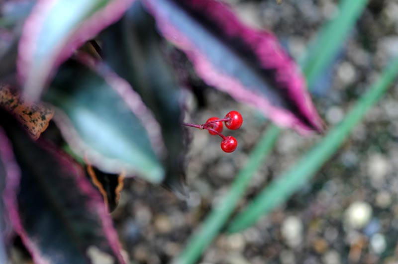 万両 投稿日時: 2014年1月23日 投稿者: shin 以前掲載した事のある小さな木の万両「紅孔雀」ですが、少し大きく成って初めて実が生りました。 この実って、植えると同じ「紅孔雀」が芽吹くのでしょうかね。 1)「マンリョウ(万両)」 ヤブコウジ科 品種名:紅孔雀 です。 2)まだ若木ですので、やっと三粒の実が生りました。 3)この実って、植えるとこの様な木に成るのでしょうかね。 4)でも、もっと小さな木の時の方が、葉の色合いが綺麗だったように・・。