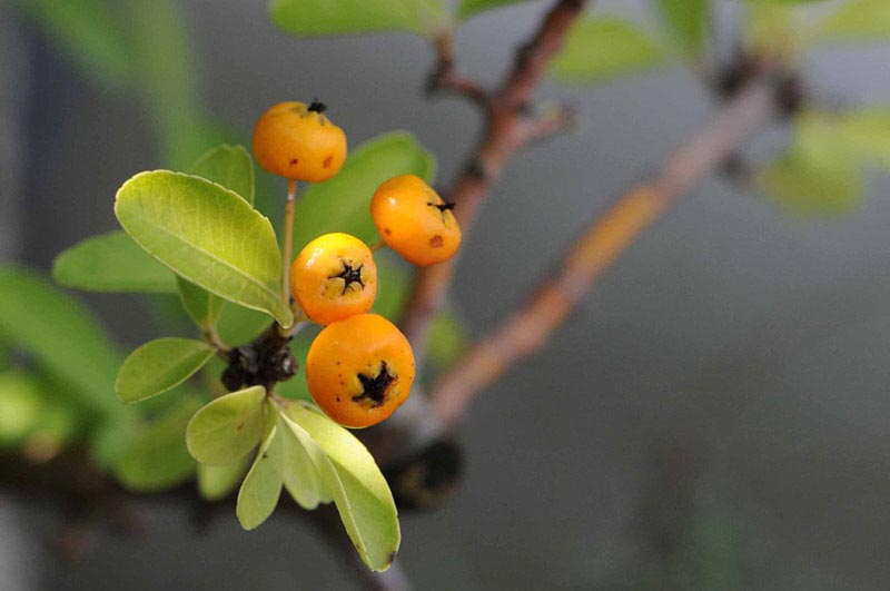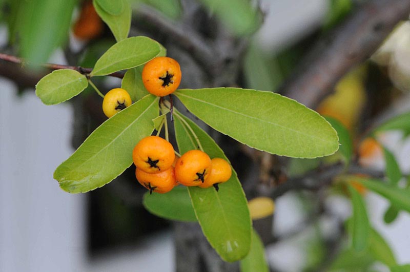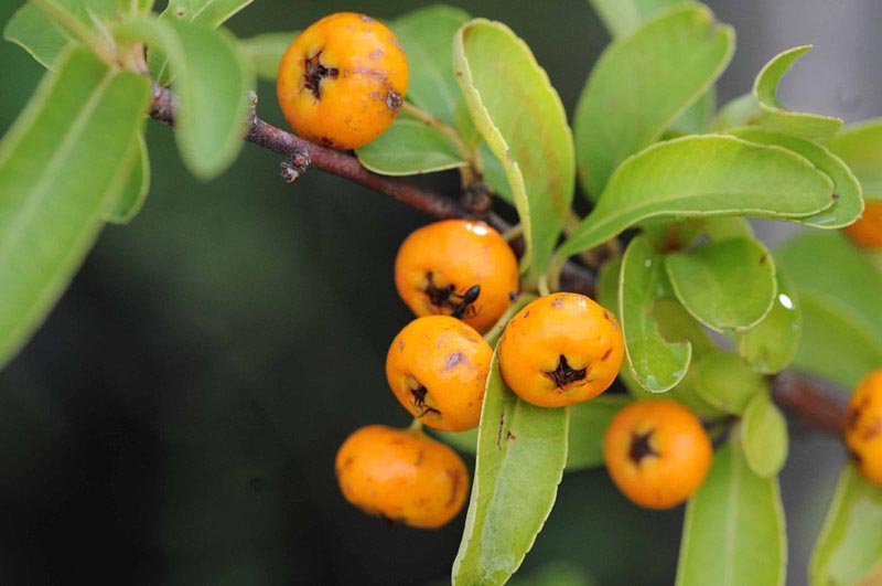 6)ホソバノトキワサンザシともいい、中国西南部原産で柿色の実を付けます。