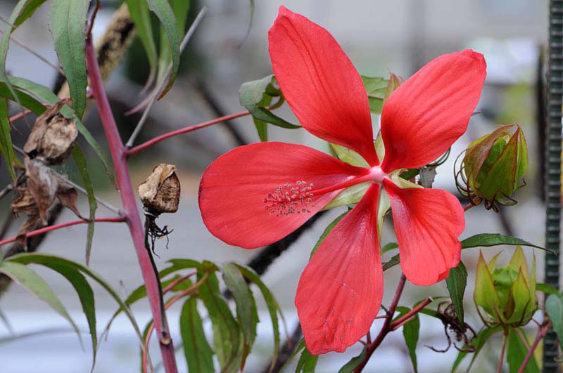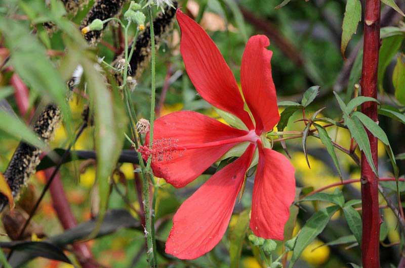 紅葉葵 投稿日時: 2014年10月7日 投稿者: shin 先だってコスモスを撮りに行った時、まだ咲き残っていた紅葉葵があったものか、ついでにそちらも撮って来ました。 今の時期でもまだ咲いているのですね。 1)「モミジアオイ(紅葉葵)」 アオイ科の宿根草。 別名:コウショッキ(紅蜀葵) 2)北米原産で、和名のモミジアオイは、葉がモミジのような形であることから付けられたようです。 3)同じ科のフヨウに似ていますが、花弁が離れているところがフヨウと違うところですね。 4)こちらは、モミジアオイの実です。