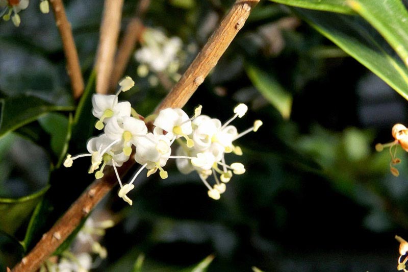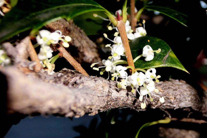 2)花期は11-12月。葉腋に白色の小花を密生させる。雌雄異株で、雄株の花は2本の雄蕊が発達し、雌株の花は花柱が長く発達して結実するそうです。