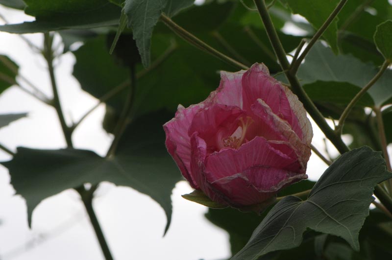 色あいの綺麗な酔芙蓉を撮るのは難しいですね。曇り空だったので、夕方に撮ったのもこんなに萎れているとは思わなかったですよ。