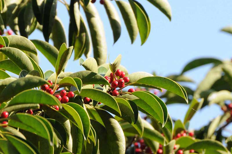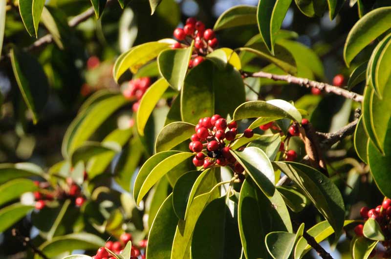 クロガネモチ、緑の葉っぱに小さな赤い実がたくさん集まっていますね。